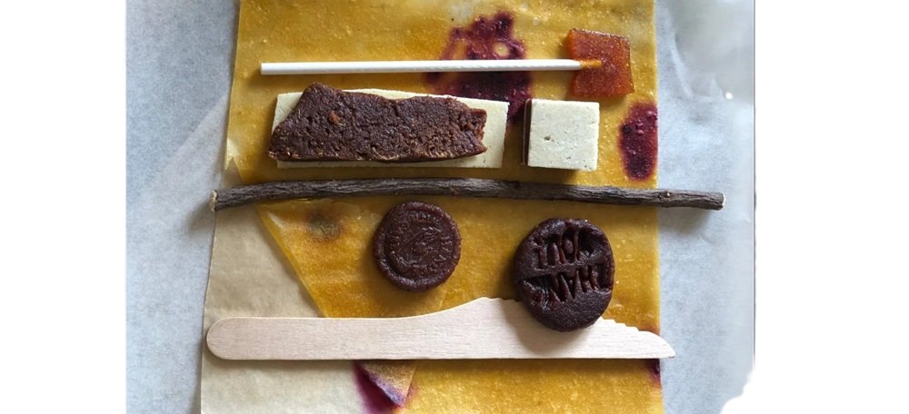 Vel van mango- of bessenpuree, verse dadeldrop, zoethout, engelse drop, muntdrop, een chocokoekje, stukje kokos, wat dadelpuree, een lolly van abrikozenpuree, een velletje ouwel en wat bieten- of wortelverf.